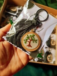 Brindes para amigos na terceira impressão do Prefiro Gente ou a primeira impressão do Diário de Roberta. Também pode ser solicitado por compra por apenas R$10,00. Chaveiro com árvore artesanal, bordado à mão,